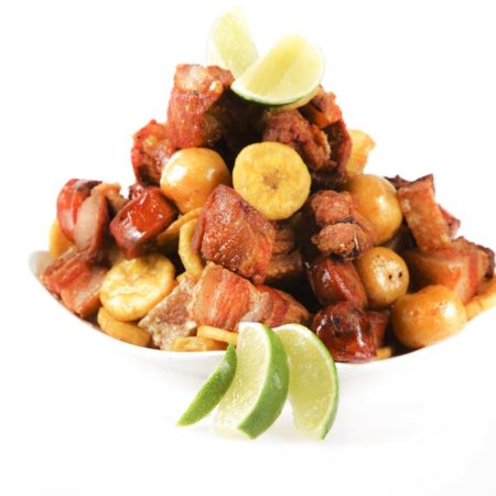 Traditional colombian breakfast of beans, grilled pork, corncake and fried plantain